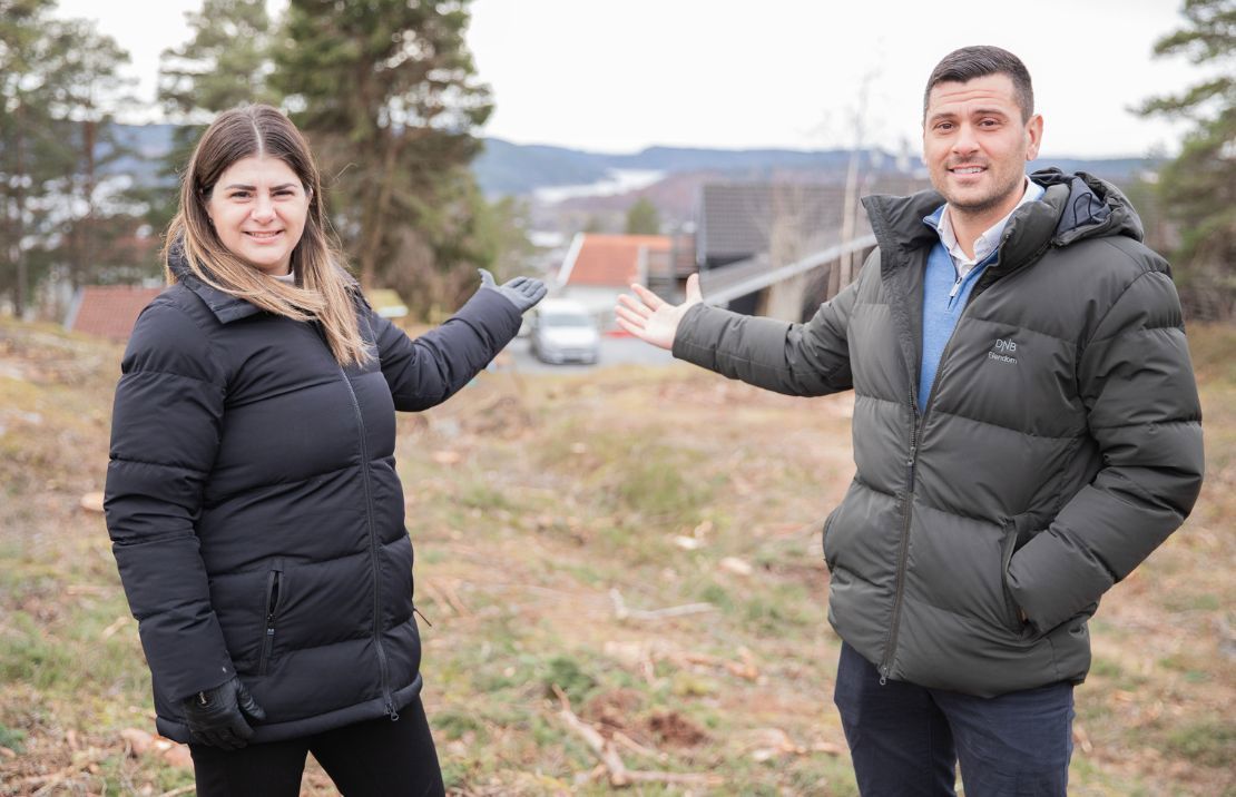 - Ja, et slikt prosjekt har knapt vært presentert i Halden noen gang, sier Linda Torp Skogli og Sabri Freddy Khattab hos DNB Eiendom Halden. De har tatt den korte bilturen fra sentrum, via Oskleiva og kan stolt vise fram tomten hvor det skal reises to bygg med tre leiligheter i hver.