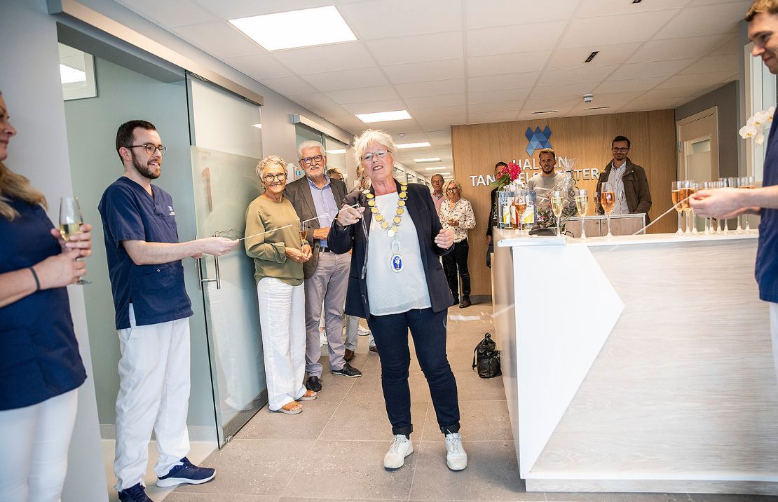Halden-ordfører Anne-Kari Holm (Sp) klipper snoren og erklærer Halden Tannhelsesenter for offisielt åpnet et par uker etter at det ble tatt i bruk.