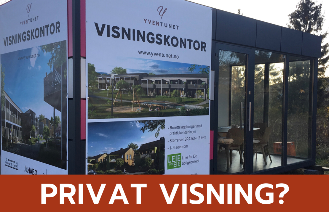 På tomten Yventunet har vi satt opp et eget visningskontor. Vi vil annonsere fellesvisninger på området, men har du lyst til å se området og snakke med eiendomsmegler alene, så er det bare å ta kontakt!